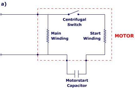 In a fractional horse power single phase motor, in order to create a high starting torque, it will be necessary to displace the phase of the auxiliary winding by 90 degrees from the main winding, to get a rotating field. This will be achieved by connecting a motorstart capacitor in series with the starting winding. This capacitor and the starting winding will be disconnected automatically, as soon as the motor reaches about %75 of its synchronious speed.