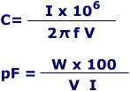 Where: | | C is capacitance in MFD I is current in amperes rms f is frequency in Hz V is volts in rms W is power in watts pF is power factor in % |